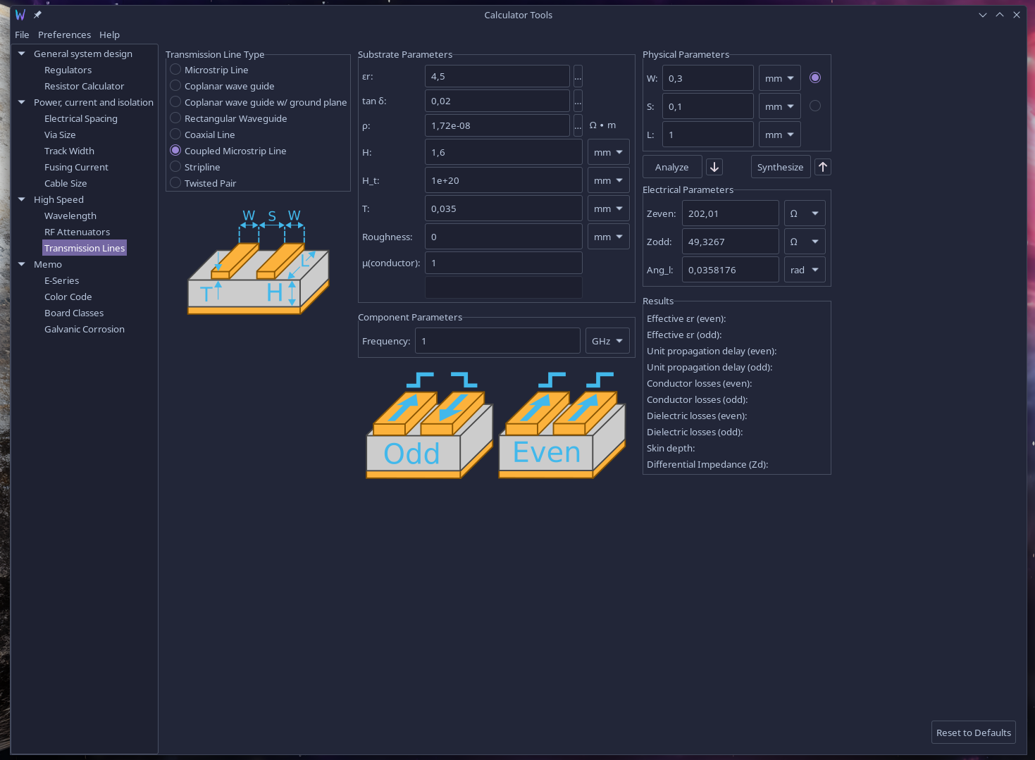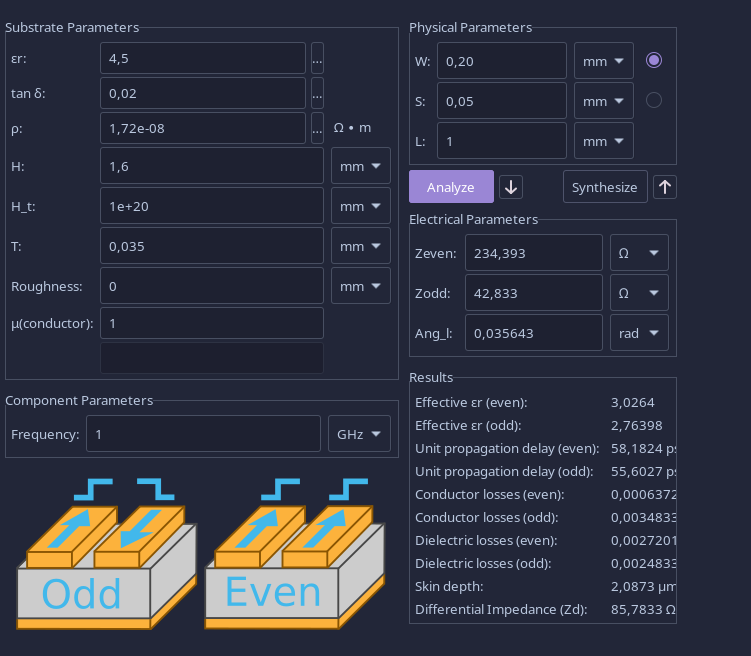 But, back to the practical side of things: this is trivial right? we put our board manufacturer's minimum parameters into the KiCad calculator tool and aim for a Zodd of about 50ohm (as Zodd = Zdiff/2), easy peasy, right? nothing we haven't done a thousand times, RIGHT?