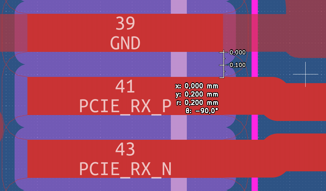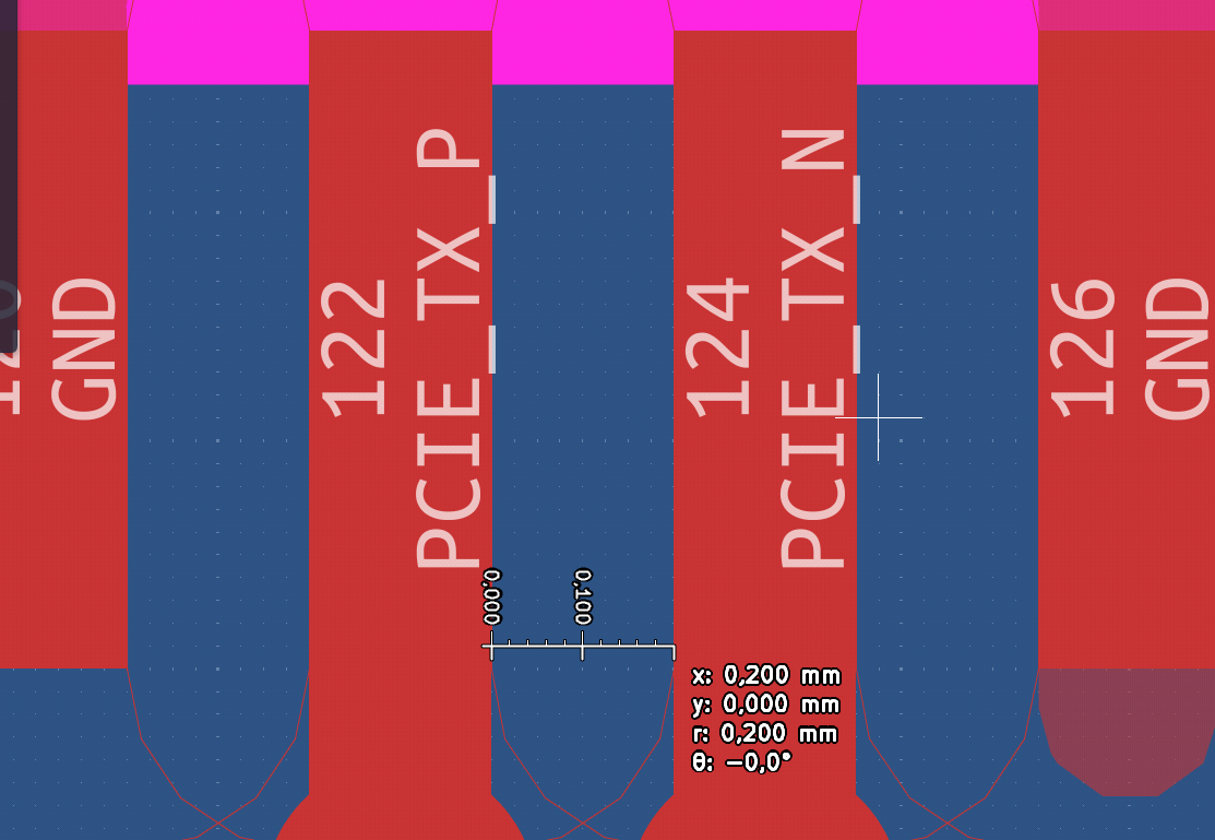 Oh no mes amis, we screwed up big time here. You see, the 100ohm differential impedance is up to PCIe 2. PCIe 3 and 4 require a 85ohm one as specified by this helpful table [2] (on a side note, dear Texas Instruments, I swear your design guidelines documentations are giving me a crash course in electronic engineering that I will forever be grateful for. The series on pcb capacitive touch sensors is so well written I thought I had accidentally purchased a book)